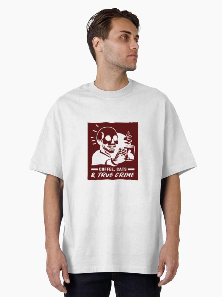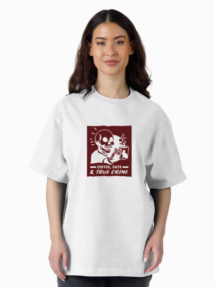 Comfy, relaxed, and always in style, this Whimsical Skeleton Graphic With Coffee Cats And True Crime Theme Oversized T-Shirt Oversized T-Shirt is perfect for everyday wear, casual outings, or easy gifting.